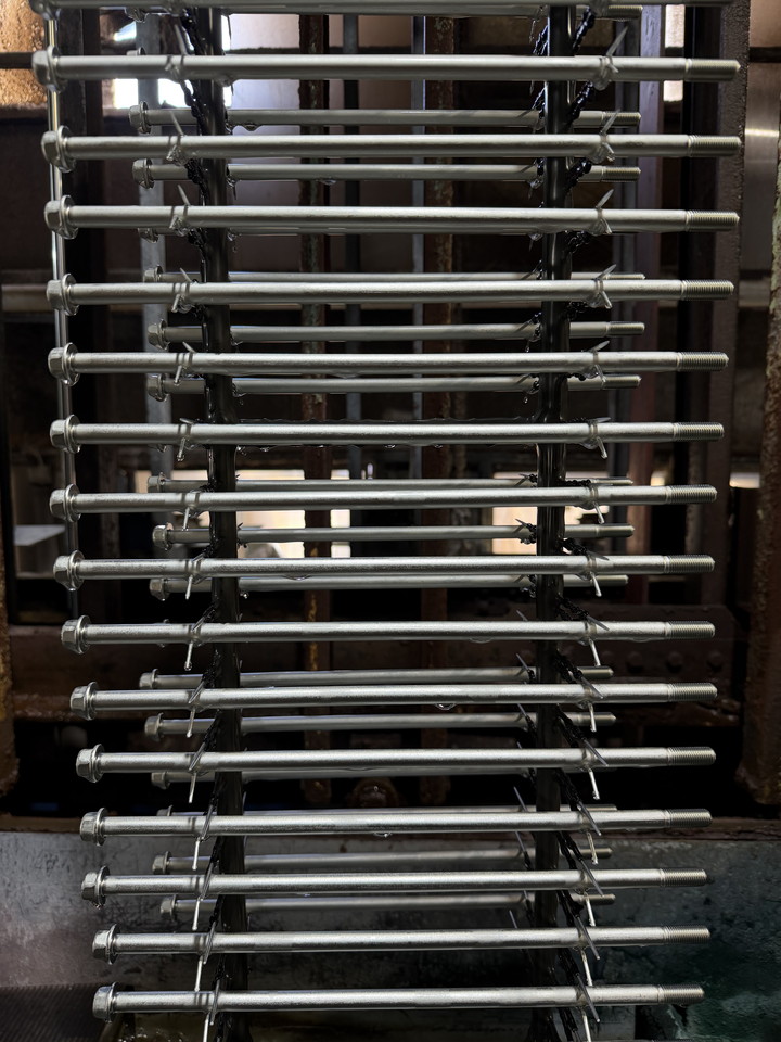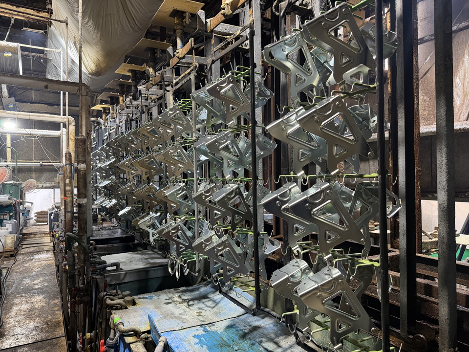 前処理を行った製品をめっき槽に入れ、電気の力を利用して金属表面に亜鉛皮膜を形成します。